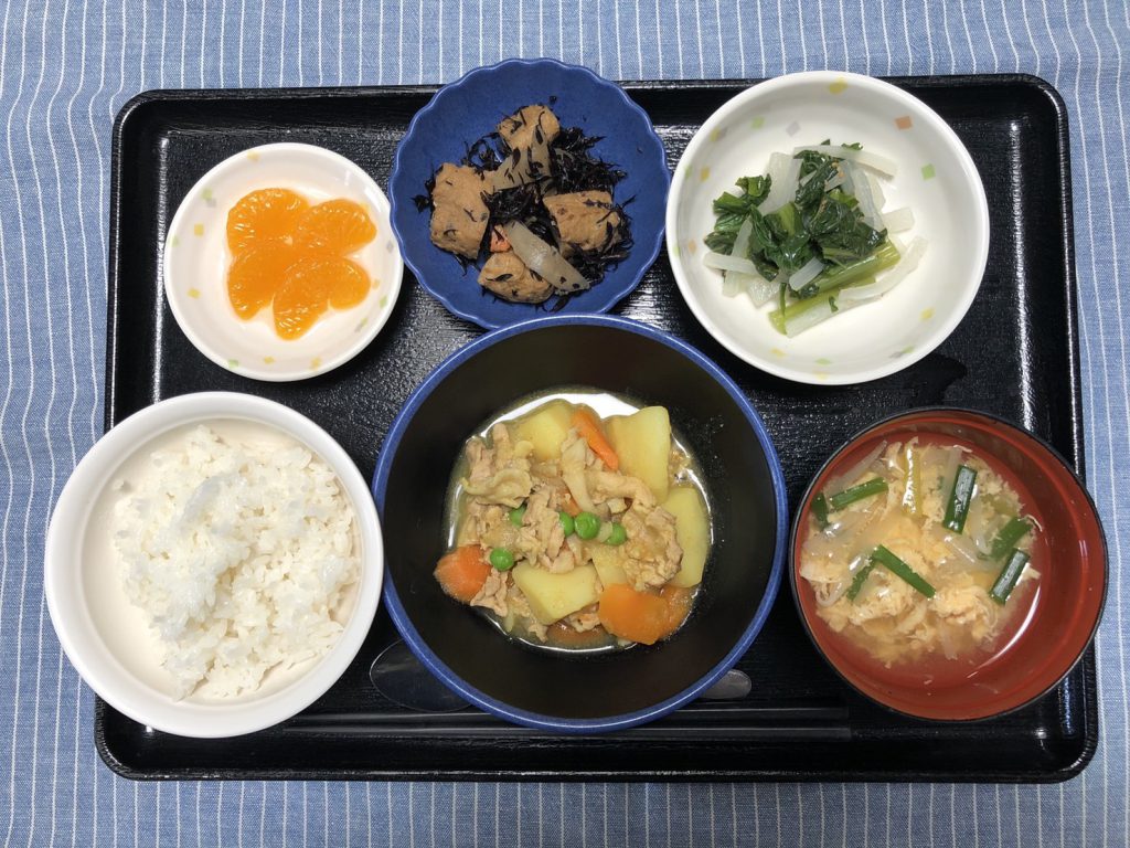 6月8日月曜日のお昼ごはんは、カレー肉じゃが・ナルム・含め煮・みそ汁・くだものでした。