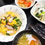 • きょうのお昼ごはんは、豚肉とみょうがの卵炒め・わさび和え・含め煮・みそ汁・くだものでした。