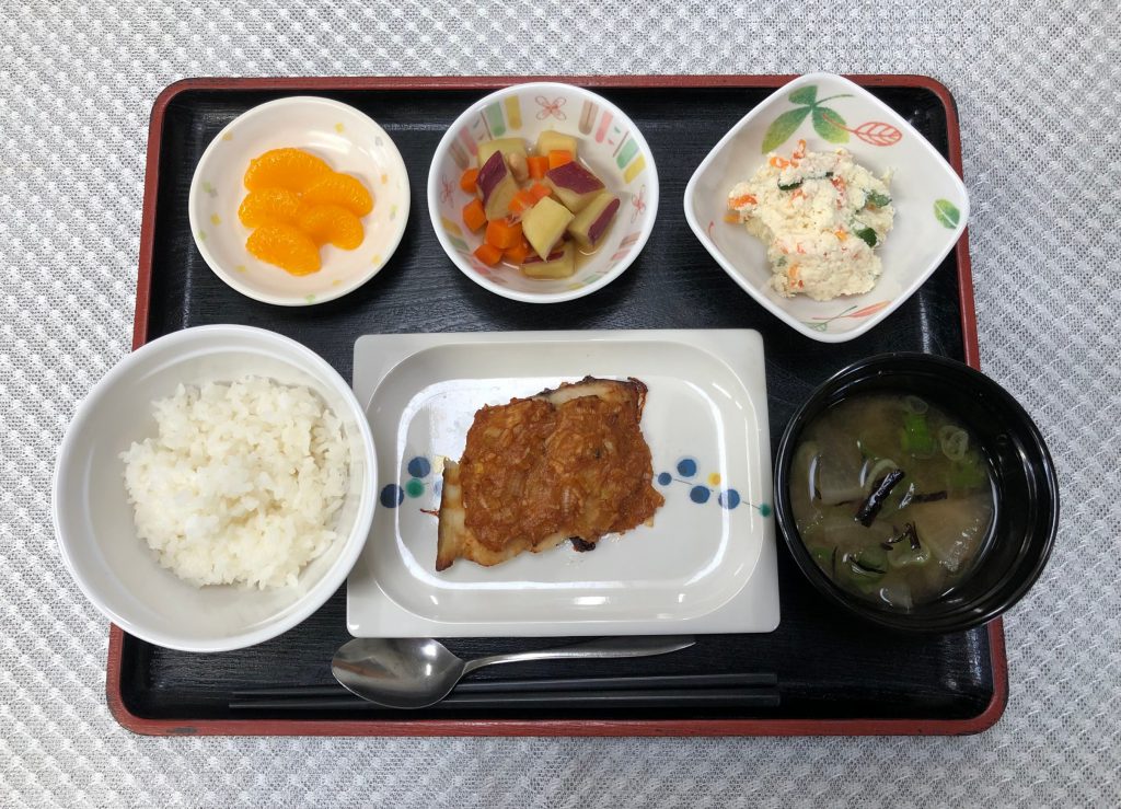 今日のお昼ごはんは、鰆のねぎみそ焼き・おからサラダ・コロコロ煮・みそ汁・くだものでした。
