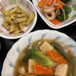 4月25日月曜日 今日のお昼ごはんは、和風ポトフ、和え物、炒り卵、みそ汁、くだものでした。