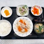 4月13日木曜日 きょうのお昼ごはんは、鶏肉と里芋のみそ煮込み・青のり和え・人参の薄甘煮・みそ汁・くだものでした。