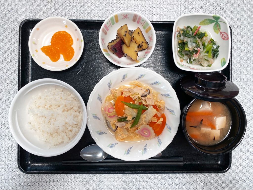 6月29日木曜日 きょうのおやつは、親子煮・具だくさんおろし・大学芋煮・みそ汁・くだものでした。