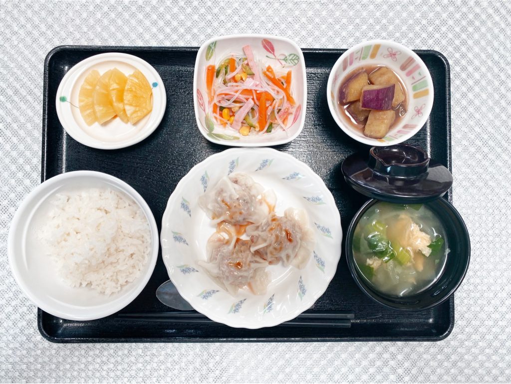 4月25日火曜日 今日のお昼ごはんは、シュウマイ・春雨サラダ・さつまいもの甘露煮・スープ・くだものでした。