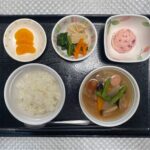 7月29日月曜日 きょうのお昼ごはんは、ウインナーと夏野菜のスープ煮・しば漬けポテト・含め煮・くだものでした。