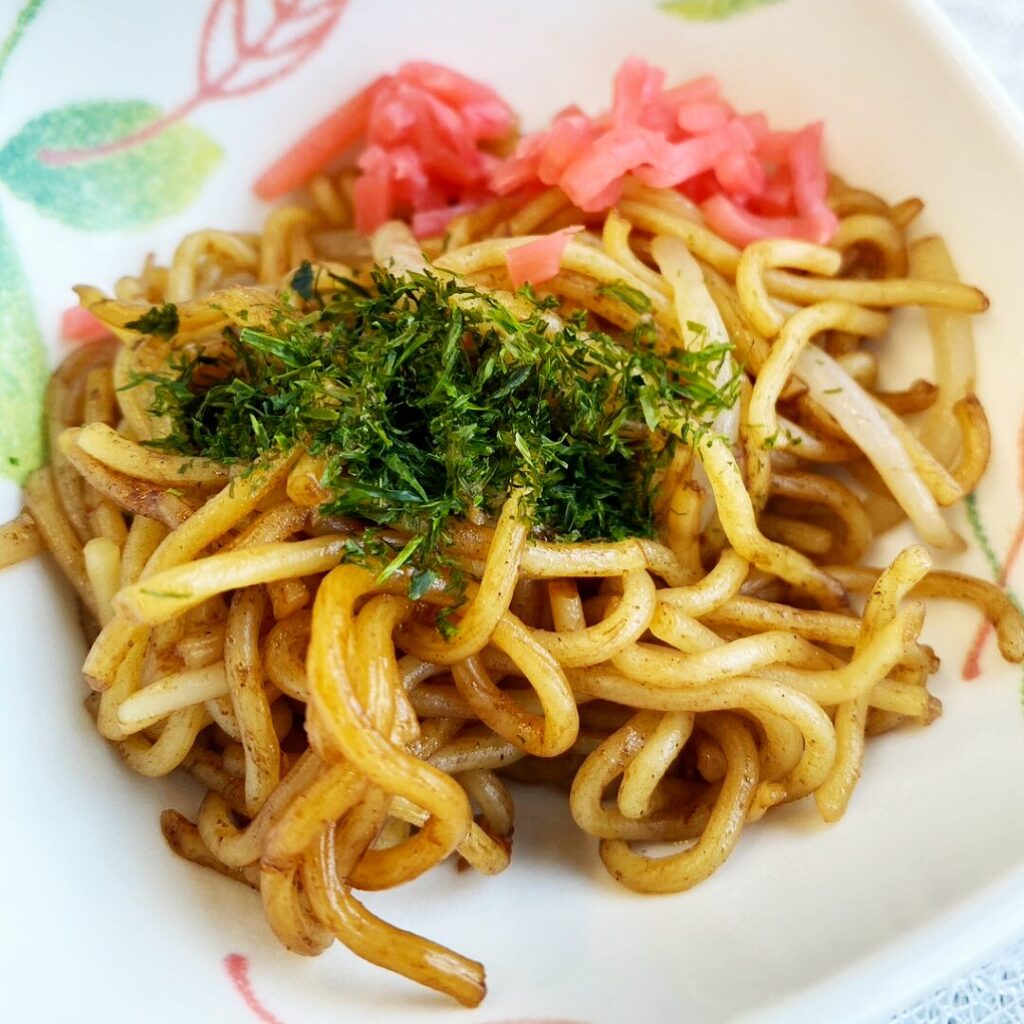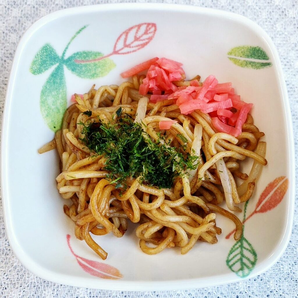 焼きそばは、主食(麺)・主菜(豚肉・魚肉)・副菜(野菜)を組み合わせた、バランスの良い一皿。