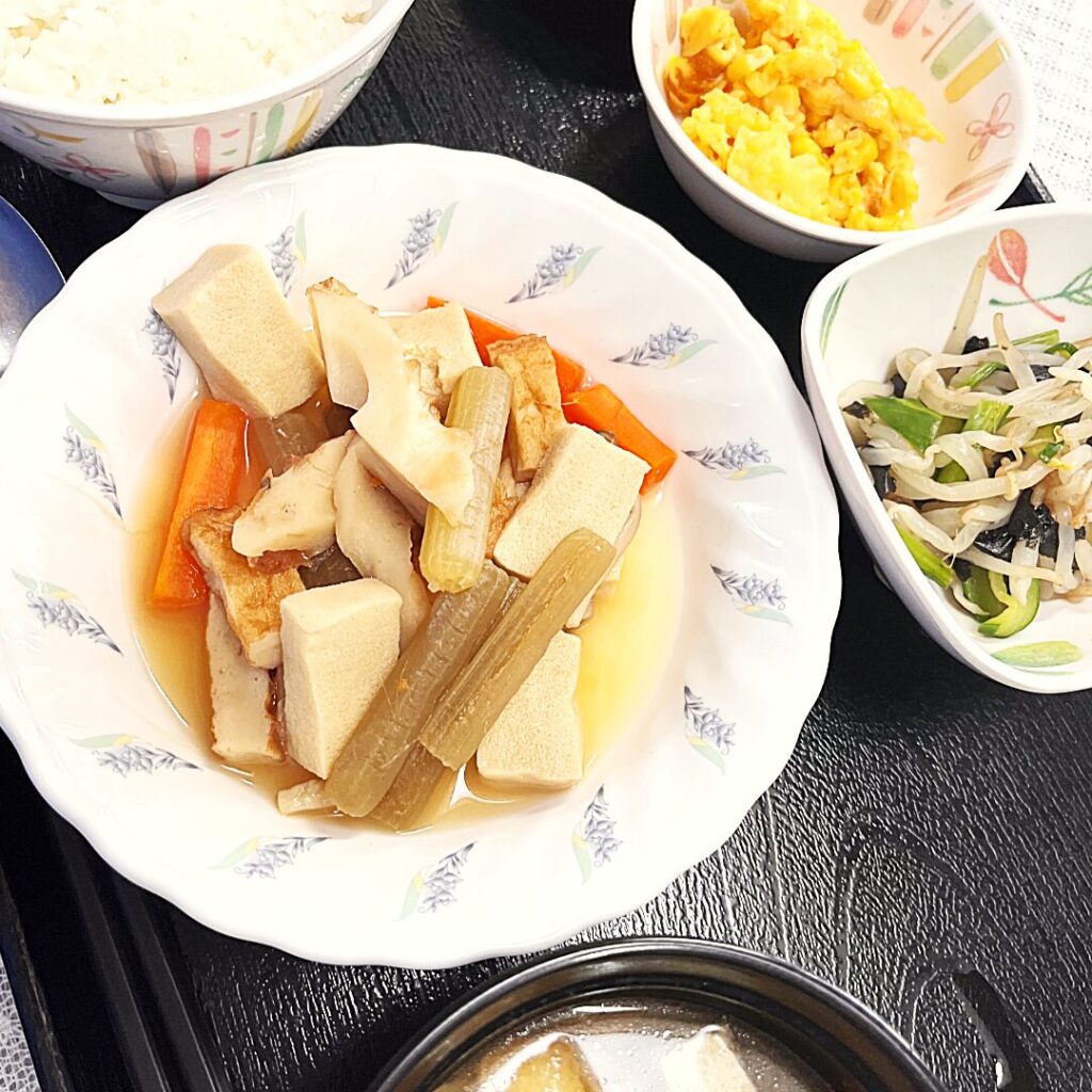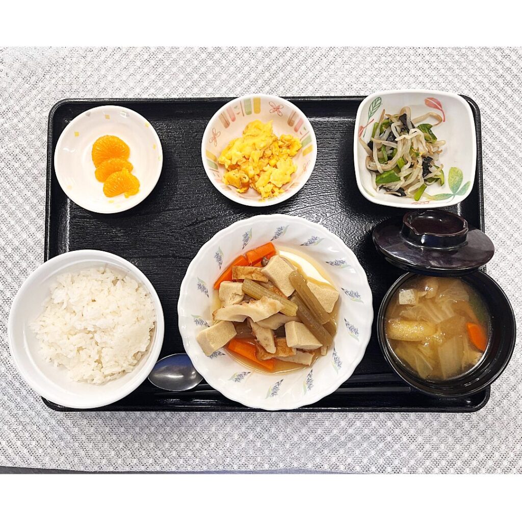 ご利用者さまからは、「炊き合わせは、やわらかくて味がよくしみていて、食べやすくて美味しかったです。フキもやわらかくて、とても美味しかったと評判でした。和え物はのりの風味があり、さっぱりした味付けで野菜の味が美味しくいただけました。コーン入り炒り卵の卵の甘みがよいあじでした。」と高評価をいただきました。職員からも「みかんの甘みが食後にぴったりで、皆さんの笑顔が増えました」との声が上がっています。