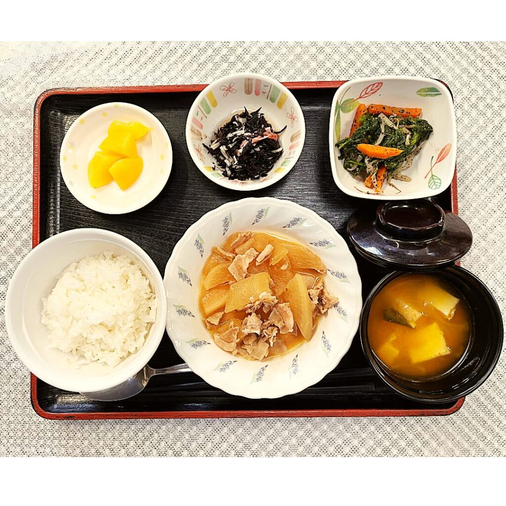 豚肉と大根のゆずみそ煮/春菊のごま和え/ひじきの酢の物/みそ汁/果物(黄桃)🍑