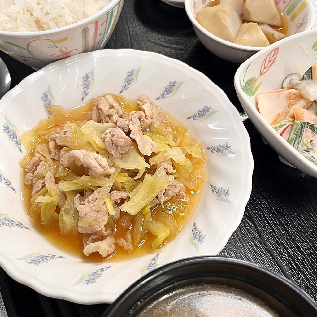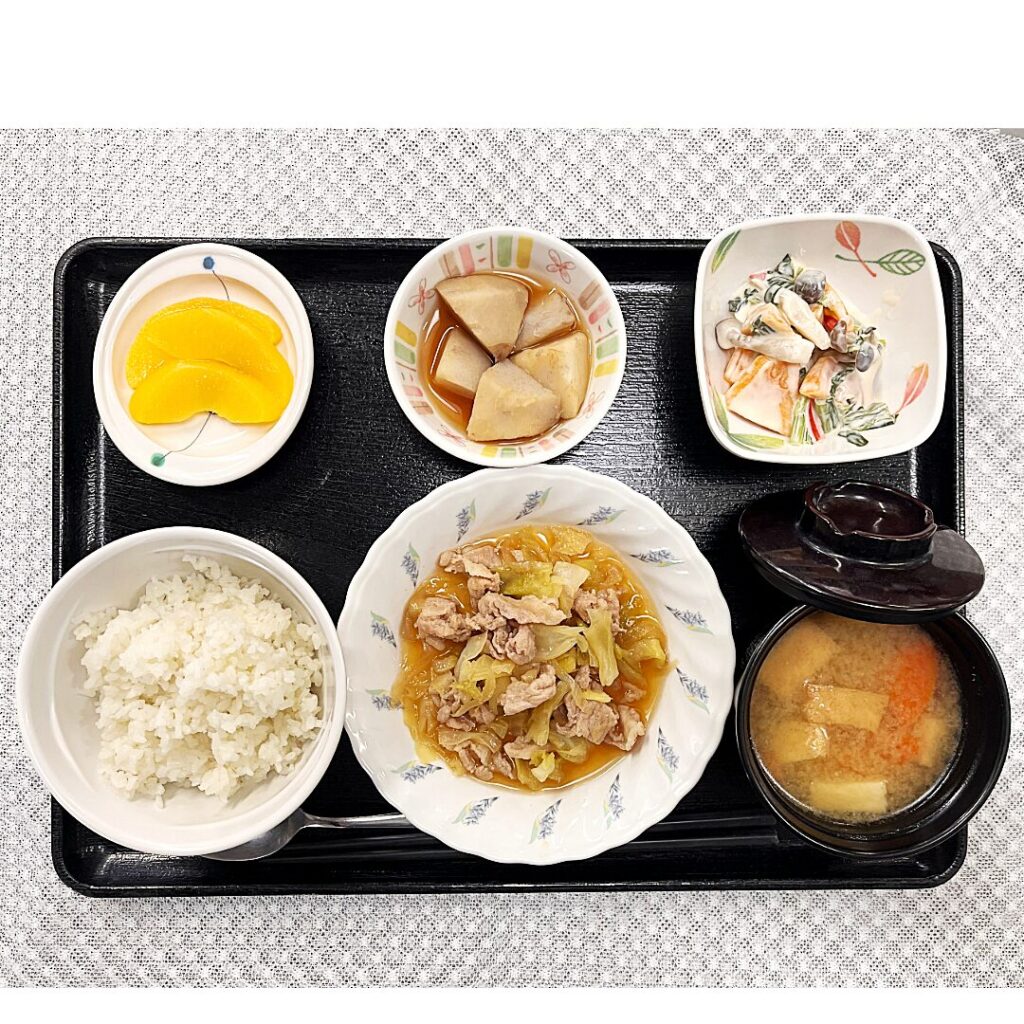 前橋市の宮城の里デイサービスセンターのきょうのお昼ごはん。豚肉のはちみつ生姜焼き、柿と小松菜のヨーグルト和え、煮ころがし、みそ汁、黄桃。寒い日こそ脱水予防に白湯もおすすめ。