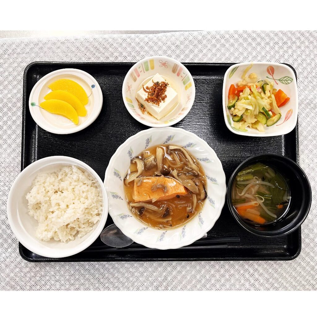 【前橋市のデイサービス】きょうの昼ごはん:蒸し鮭のきのこソースでたんぱく質|煮奴・みそ汁で“やさしい”食べやすさ(12月23日 火曜日)