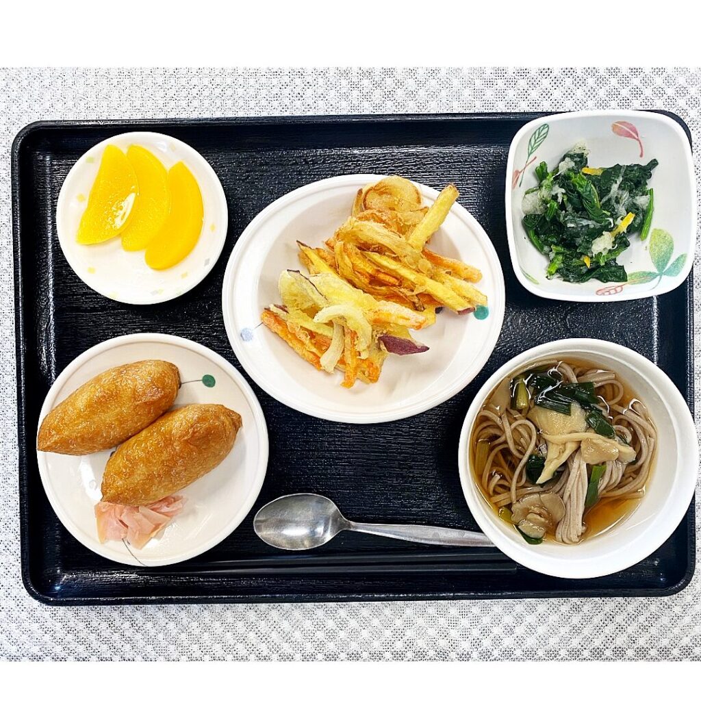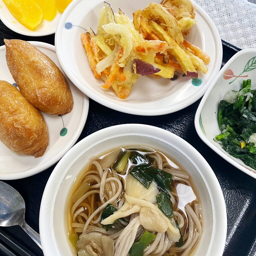• 【前橋市のデイサービス昼食】12月30日(火) 年内最終営業のきょうのお昼ごはん|おそば・いなり寿司・野菜のかき揚げ