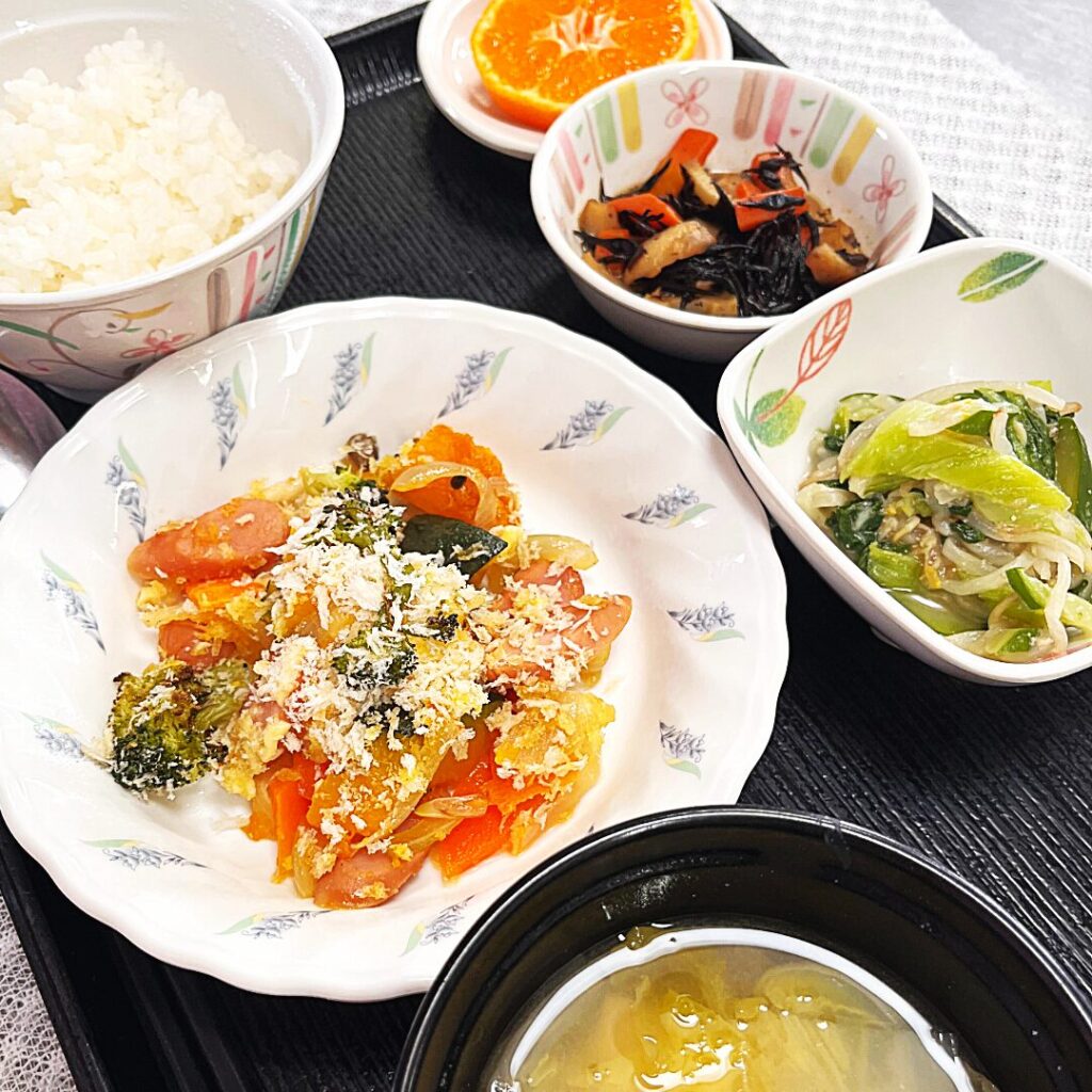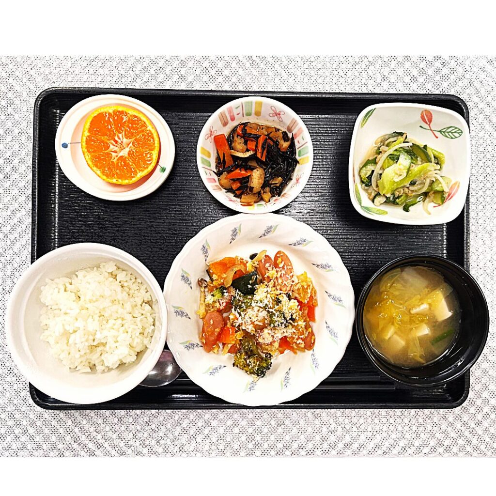 今回の献立は、たんぱく質・野菜・海藻・発酵食品・果物をバランスよく取り入れた、