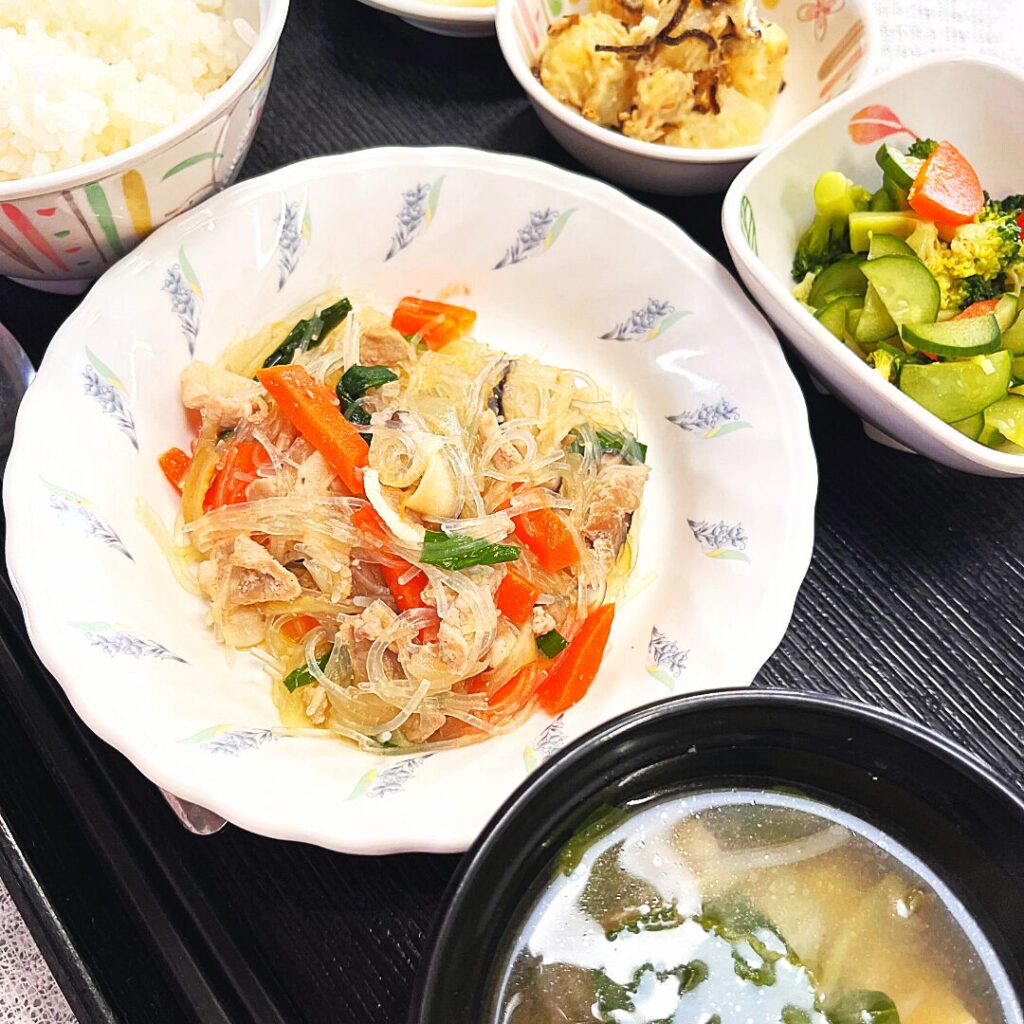 豚肉と春雨の中華炒め:たんぱく質をしっかり摂りながら、食べやすい献立。