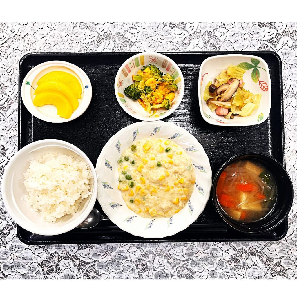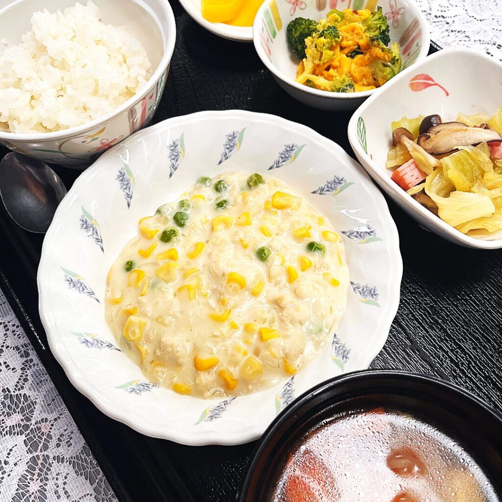 今回の昼食は、やわらかく食べやすい「挽肉とコーンのクリーム煮」が中心で、食べやすさと栄養バランスの両方を意識した献立でした。