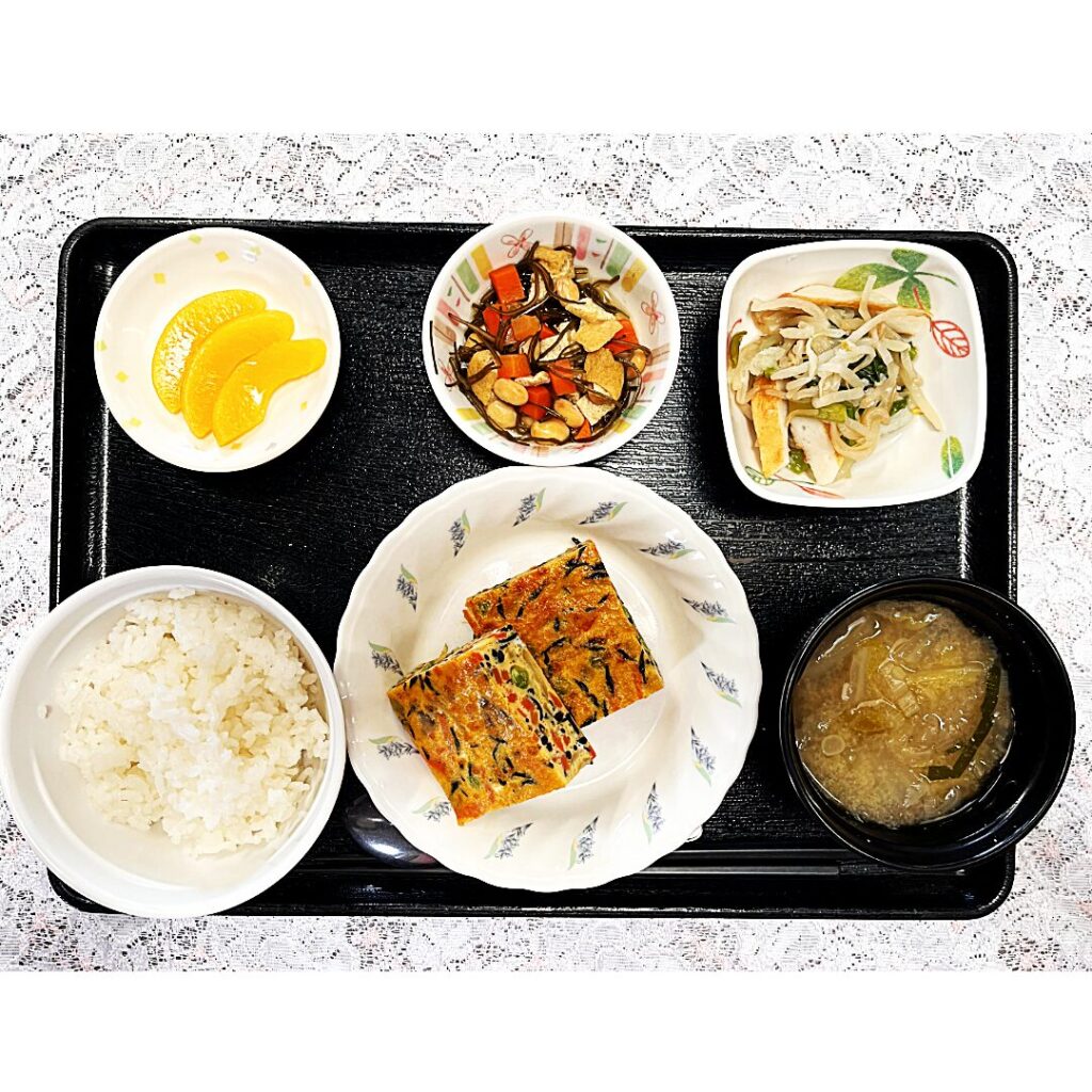 **五目卵焼き・おろし和え・切り昆布煮・みそ汁・果物(黄桃)**です。