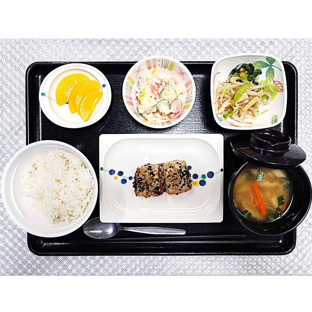 今回の昼食は、春が旬の鰆を中心に、野菜のおかずやみそ汁、果物を組み合わせた、季節感と栄養バランスのある献立です。