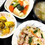 • きょうのお昼ごはんは、豚肉と里芋のみそ煮込み、ひじき和え、じゃこ煮、みそ汁、果物でした。